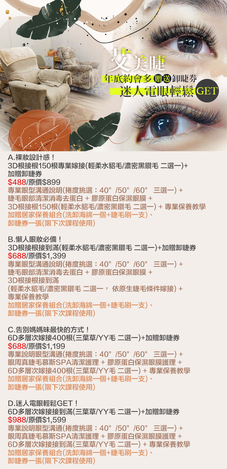 A.裸妝設計感!3D根接根150根專業嫁接(輕柔水貂毛/濃密黑鑽毛 二選一)+加贈卸睫券 / B.懶人眼妝必備!3D根接根接到滿(輕柔水貂毛/濃密黑鑽毛 二選一)+加贈卸睫券 / C.告別媽媽味最快的方式!6D多層次嫁接400根(三葉草/YY毛 二選一)+加贈卸睫券 / D.迷人電眼輕鬆GET!6D多層次嫁接接到滿(三葉草/YY毛 二選一)+加贈卸睫券