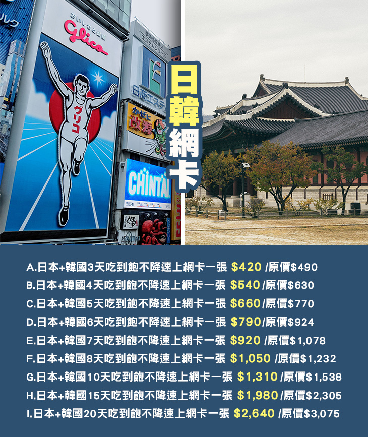 B.日本+韓國4天吃到飽不降速上網卡一張