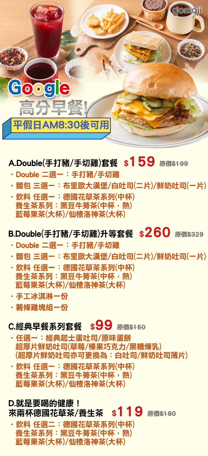 A.Double(手打豬/手切雞)套餐 / B.Double(手打豬/手切雞)升等套餐 / C.經典早餐系列套餐 / D.就是要喝的健康!來兩杯德國花草茶/養生茶