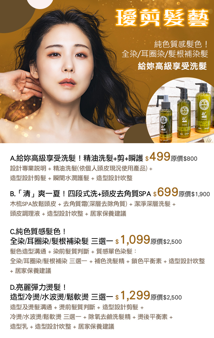 A.給妳高級享受洗髮!精油洗髮+剪+瞬護 / B.「清」爽一夏!四段式洗+頭皮去角質SPA / C.純色質感髮色!全染/耳圈染/髮根補染髮 三選一 / D.亮麗彈力燙髮!造型冷燙/水波燙/鬆軟燙 三選一