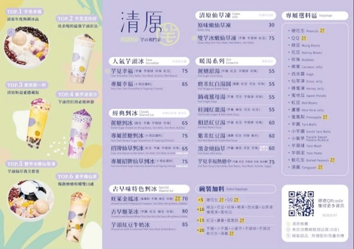 清原芋圓主打手工芋圓、湯圓、冰品、燒仙草、芋頭招牌飲品、台灣茶類等品項,冰的熱的通通品嚐得到,一年四季都能滿足饕客欲求不滿的味蕾!清原芋圓是基於一個年輕人的夢想而創立的甜點品牌,原本是一位普通上班族的老闆,為了讓一成不變的生活有點變化,選擇用工作之餘的時間來圓他的創業夢,而在一次因緣際會下他接觸到了芋圓,讓他有了新的想法,他覺得芋圓一定可以像珍珠奶茶一樣一直流傳下去,並透過好的原物料,層層堆疊出迷人美味,大人小孩都會喜歡,美好的一天就該在好吃的甜品中度過呀!