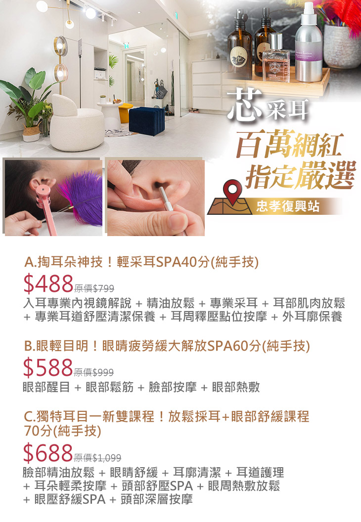 A.掏耳朵神技!輕采耳SPA40分(純手技) / B.眼輕目明!眼晴疲勞緩大解放SPA60分(純手技) / C.獨特耳目一新雙課程!放鬆採耳+眼部舒緩課程70分(純手技)