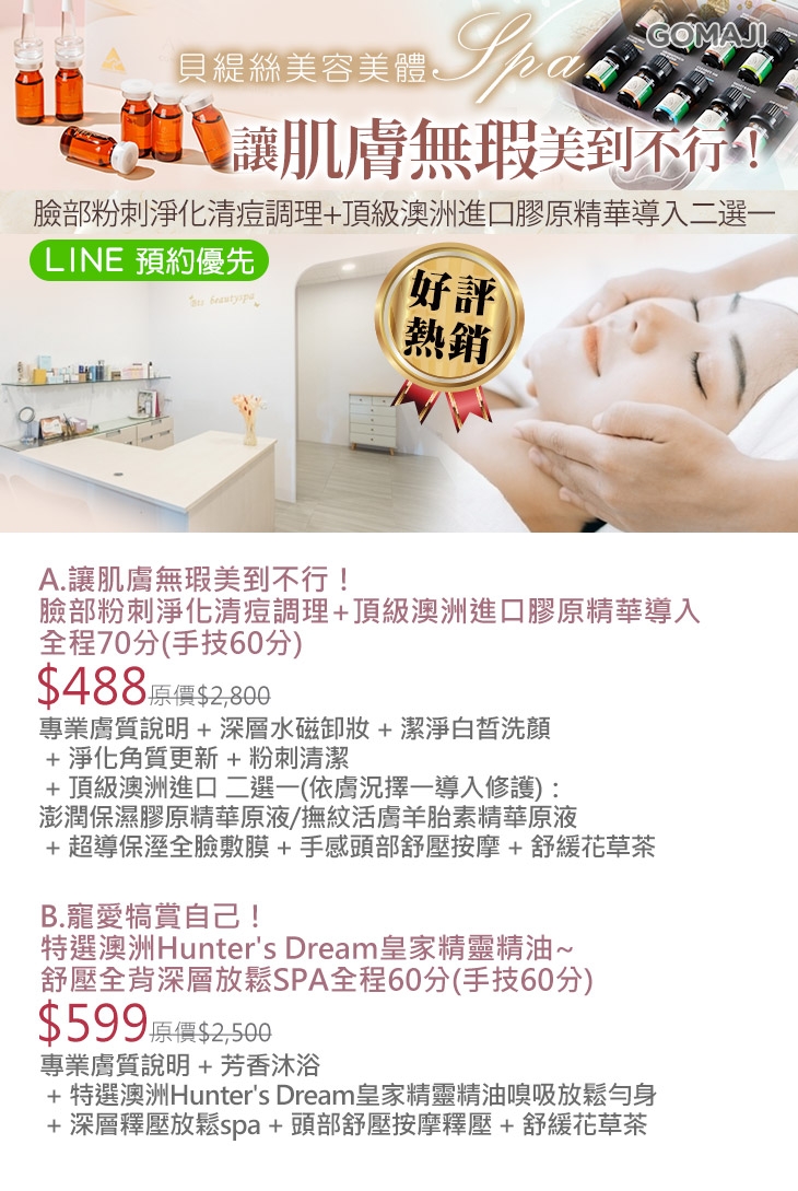 A.讓肌膚無瑕美到不行! 臉部粉刺淨化清痘調理+頂級澳洲進口膠原精華導入全程70分(手技60分) / B.寵愛犒賞自己!特選澳洲Hunter's Dream皇家精靈精油~舒壓全背深層放鬆SPA全程60分(手技60分)