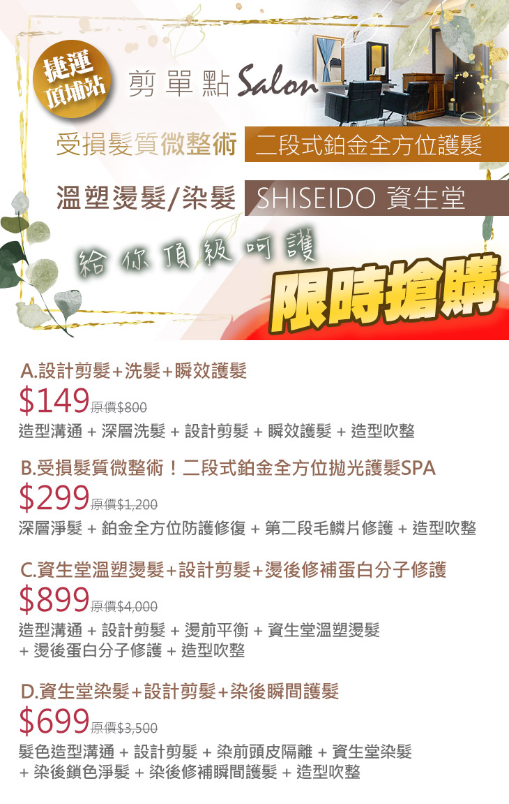 A.設計剪髮+洗髮+瞬效護髮 / B.受損髮質微整術!二段式鉑金全方位拋光護髮SPA / C.資生堂溫塑燙髮+設計剪髮+燙後修補蛋白分子修護 / D.資生堂染髮+設計剪髮+染後瞬間護髮