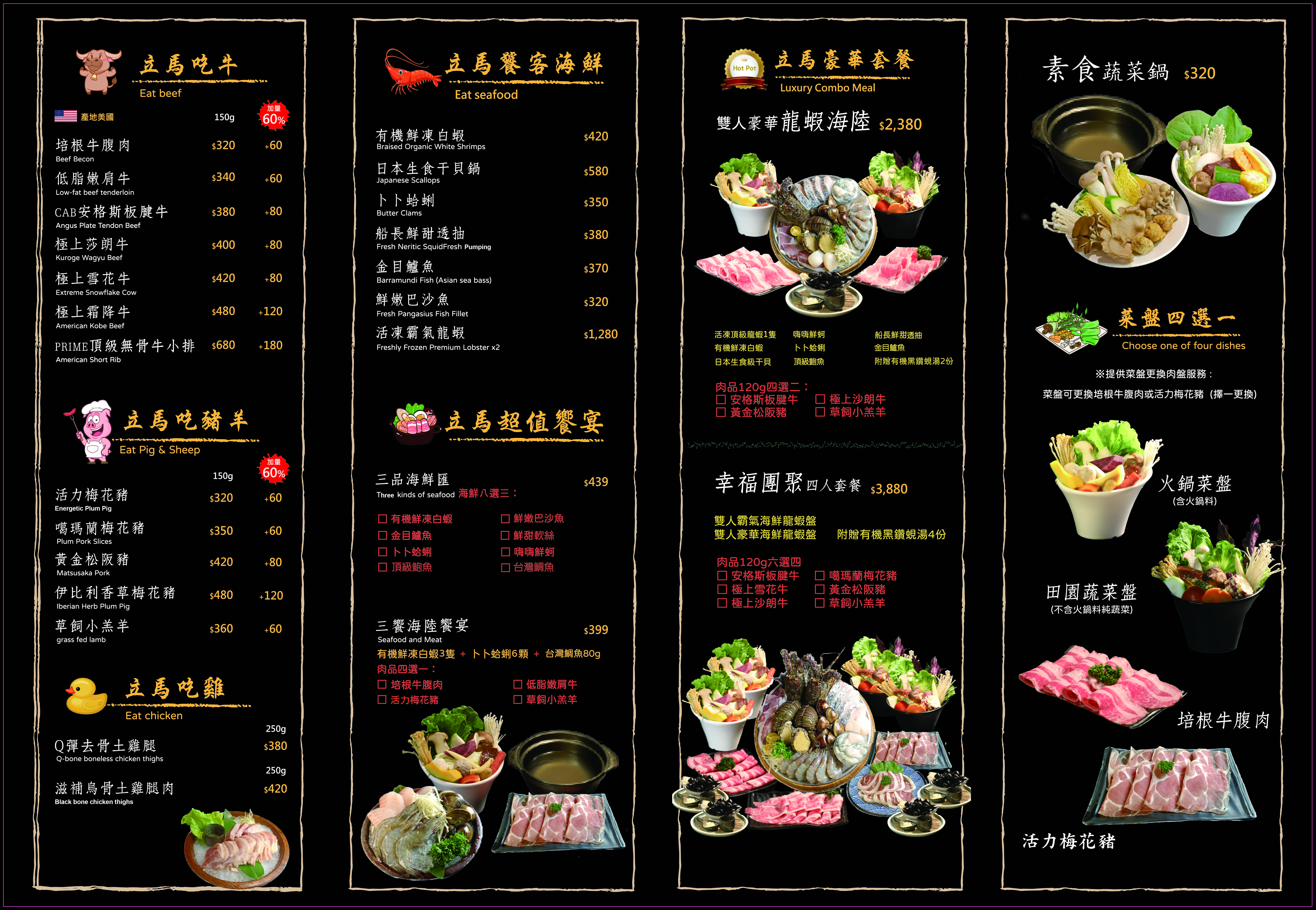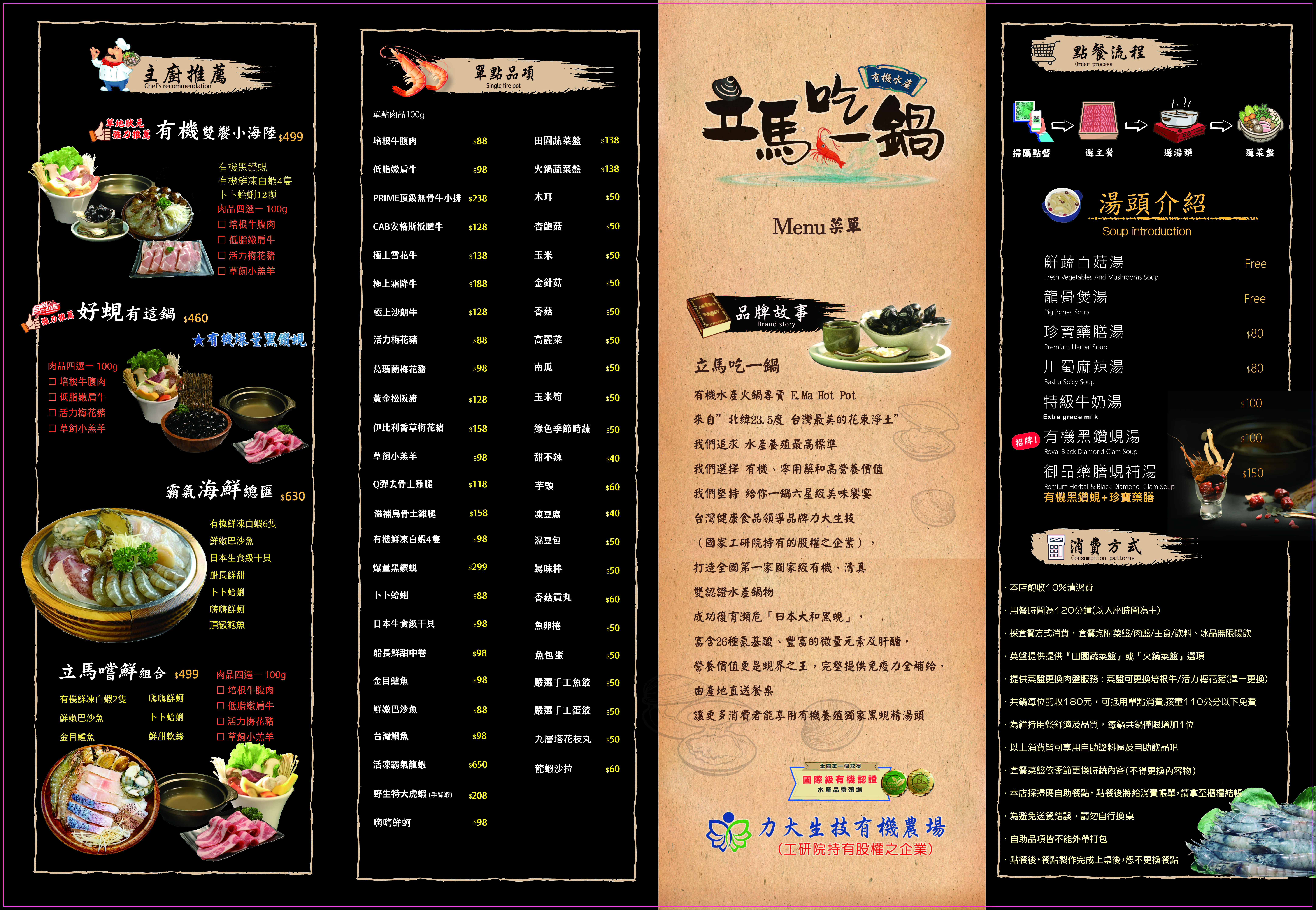 【立馬吃一鍋,有機水產鍋物】擁有自己的水產養殖場,所有的養殖過程,皆遵循有機系統,其養殖出來的水產,品質純淨,給予消費者食安上的承諾。說到有機水產,便不能不提到有機三寶-招牌日本黑蜆、有機無刺的虱目魚與白蝦,良好的品質,在鍋湯中不斷燉煮,自然、甘醇、鮮甜的美味,滲入滴滴湯水當中,創造韻味無窮的湯底,保證讓您一嚐驚艷、夜夜難忘、回味無窮!