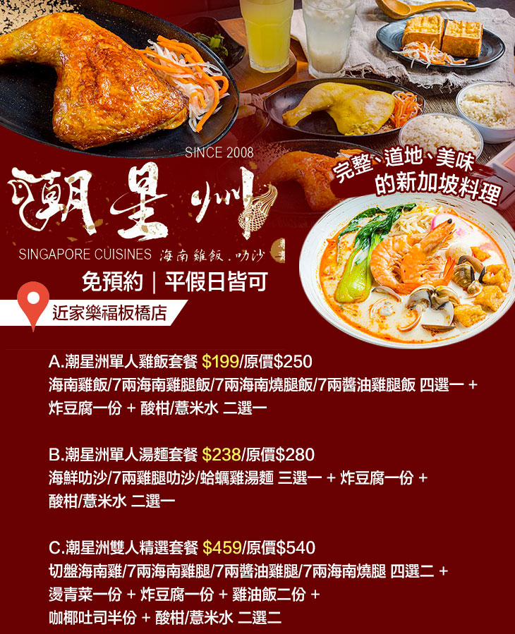 最道地、最美味、菜色最齊全的新加坡料理在這裡!位於家樂福板橋店附近的潮星州海南雞飯,本次與夠麻吉合作、推好康~在這邊你可以吃到各式各樣美味又道地的新加坡料理,是在地人吃過都推薦的好滋味!喜歡吃新加坡料理的你,趕快揪朋友一起來品嚐吧!