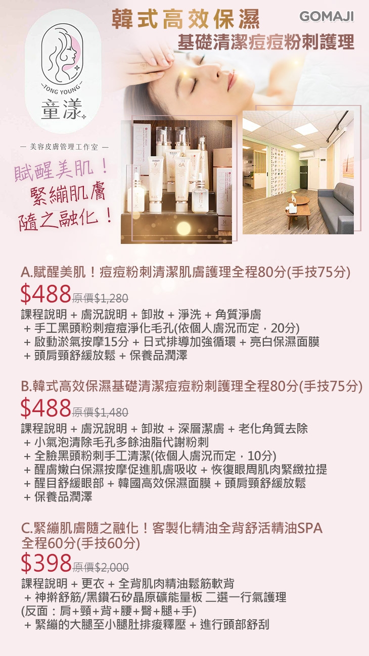 A.賦醒美肌!痘痘粉刺清潔肌膚護理全程80分(手技75分) / B.韓式高效保濕基礎清潔痘痘粉刺護理全程80分(手技75分) / C.緊繃肌膚隨之融化!客製化精油全背舒活精油SPA全程60分(手技60分)