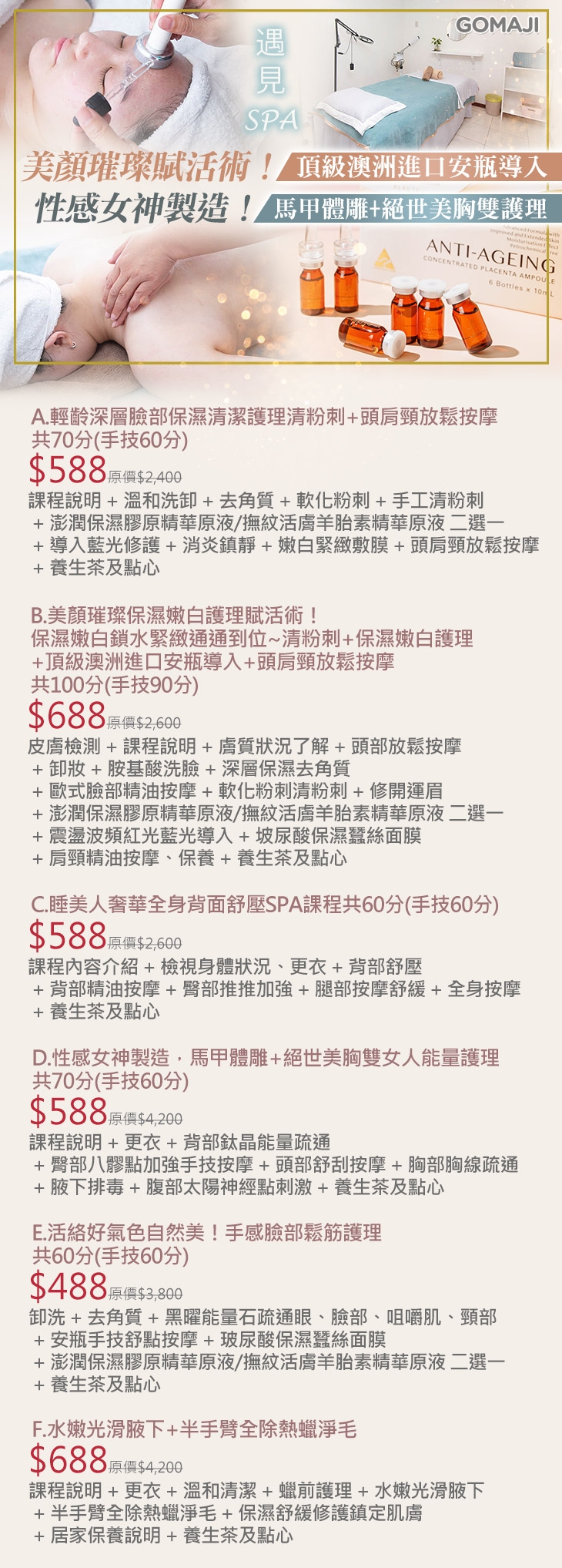 A.輕齡深層臉部保濕清潔護理清粉刺+頭肩頸放鬆按摩共70分(手技60分) / B.美顏璀璨保濕嫩白護理賦活術!保濕嫩白鎖水緊緻通通到位~清粉刺+保濕嫩白護理+頂級澳洲進口安瓶導入+頭肩頸放鬆按摩共100分(手技90分) / C.睡美人奢華全身背面舒壓SPA課程共60分(手技60分) / D.性感女神製造,馬甲體雕+絕世美胸雙女人能量護理共70分(手技60分) / E.活絡好氣色自然美!手感臉部鬆筋護理共60分(手技60分) / F.水嫩光滑腋下+半手臂全除熱蠟淨毛