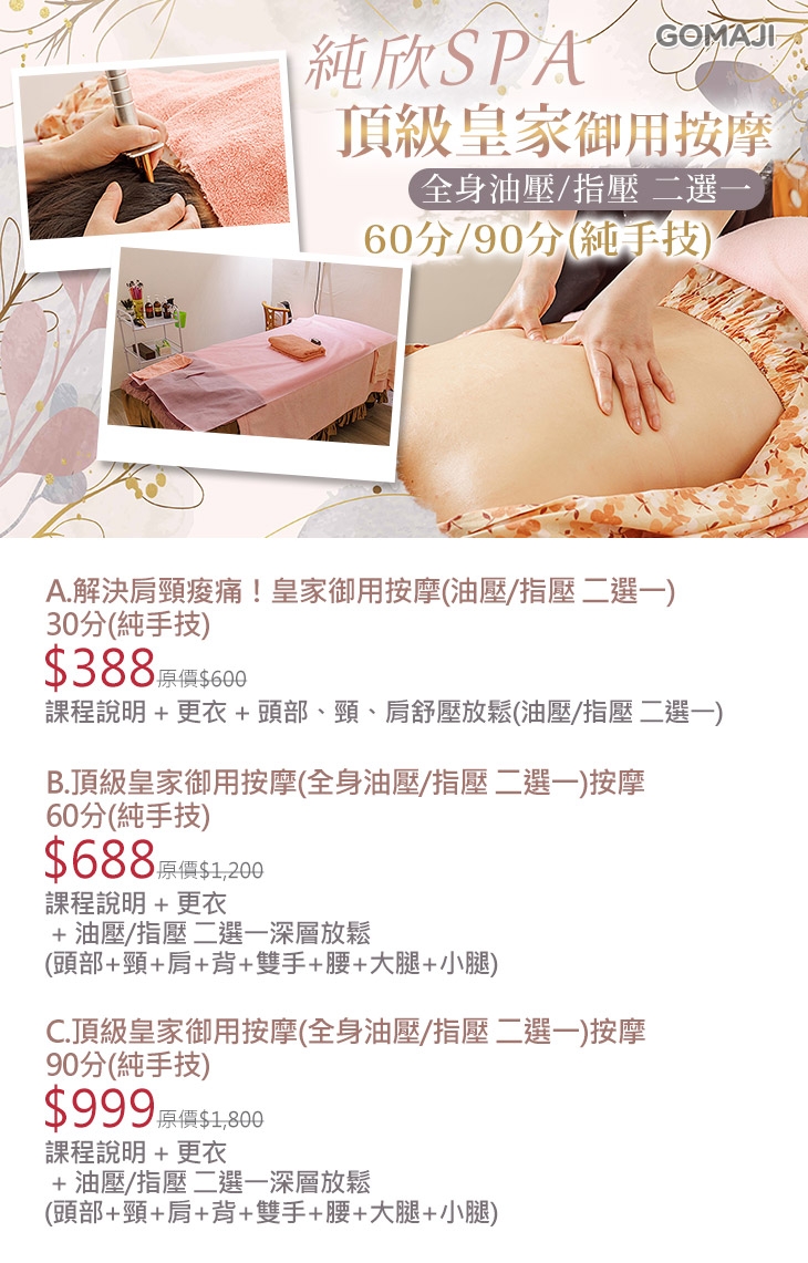 A.解決肩頸痠痛!皇家御用按摩(油壓/指壓 二選一)30分(純手技) / B.頂級皇家御用按摩(全身油壓/指壓 二選一)按摩60分(純手技) / C.頂級皇家御用按摩(全身油壓/指壓 二選一)按摩90分(純手技)