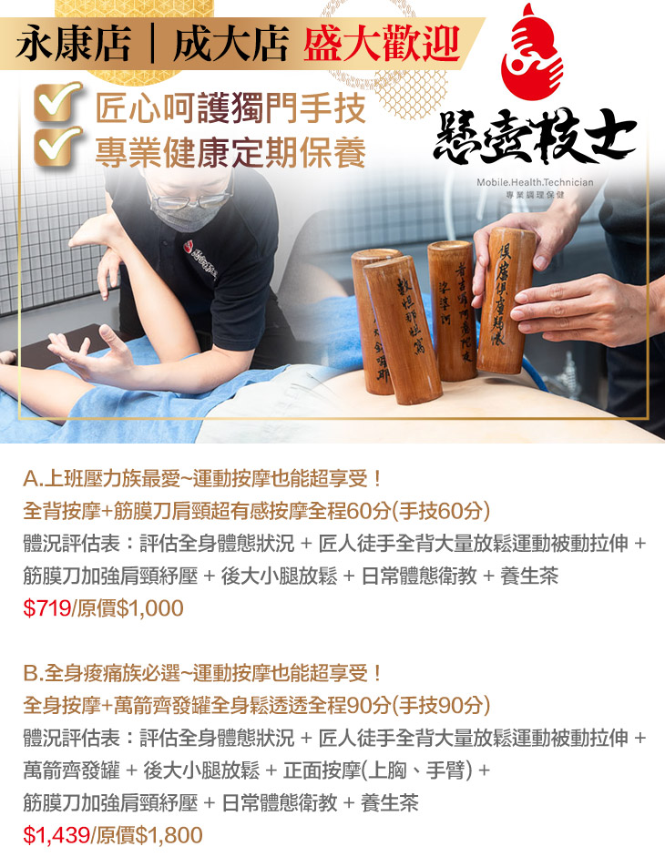 A.上班壓力族最愛~運動按摩也能超享受 全背按摩+筋膜刀肩頸超有感按摩全程60分(手技60分) / B.全身痠痛族必選~運動按摩也能超享受 全身按摩+萬箭齊發罐全身鬆透透全程90分(手技90分)