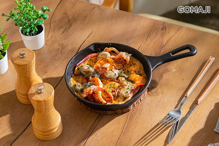 彈牙多汁的鮮蝦、肥美飽滿的蛤蜊、紮實細緻的干貝以及富有嚼勁的中卷,各個以迷人的模樣點綴在濕潤分明的燉飯上,層次繽紛的精緻擺盤,一端上桌,便深深吸引了目光。趁熱品嚐,鮮香濃郁、軟而不爛的蝦膏燉飯,還咀嚼得白米粒粒香Q的口感,而蝦膏獨特的香氣與爐烤海鮮的甜美氣息互相交織,於唇齒之間綻放迸出驚喜火花,保證令人愛不釋口、回味無窮!