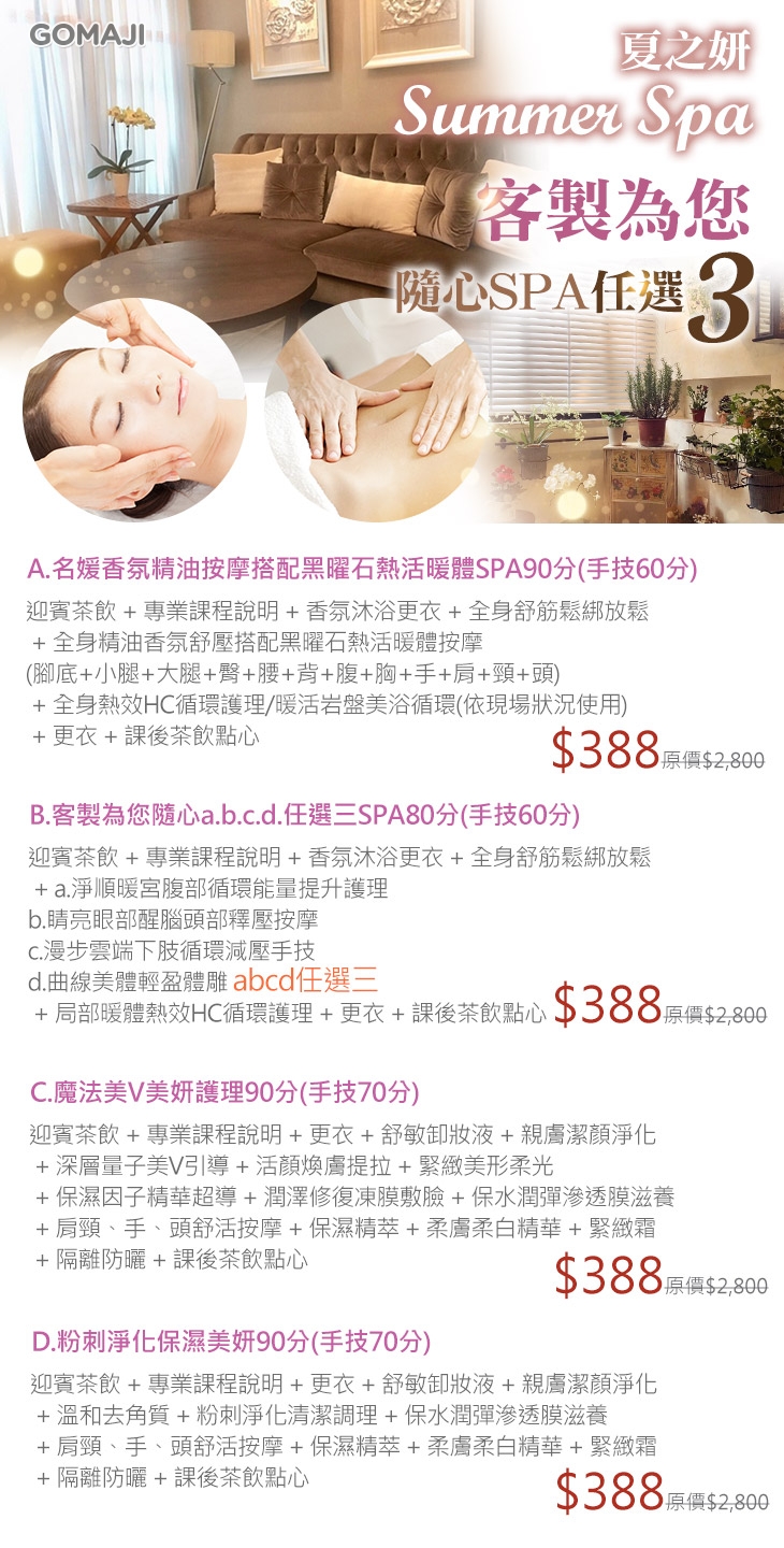 A.名媛香氛精油按摩搭配黑曜石熱活暖體SPA90分(手技60分) / B.客製為您隨心a.b.c.d.任選三SPA80分(手技60分) / C.魔法美V美妍護理90分(手技70分) / D.粉刺淨化保濕美妍90分(手技70分)