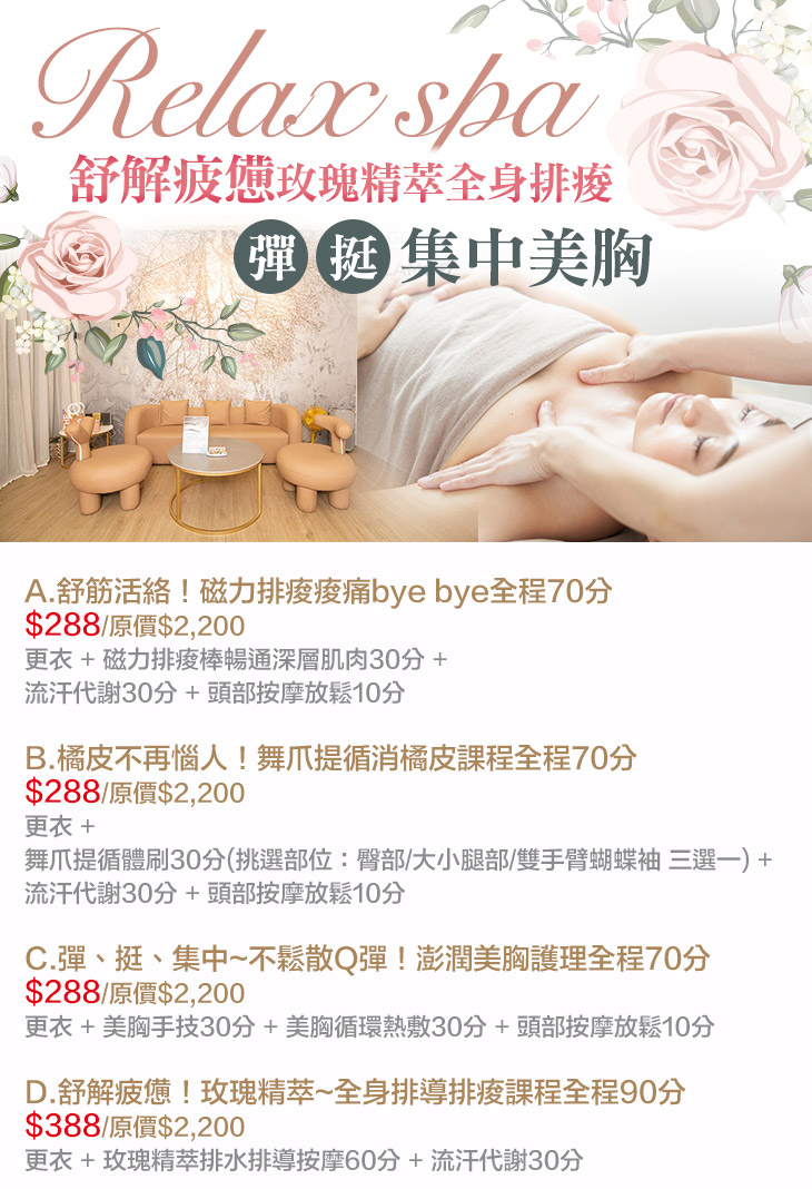 A.舒筋活絡!磁力排痠痠痛bye bye全程70分 / B.橘皮不再惱人!舞爪提循消橘皮課程全程70分 / C.彈、挺、集中~不鬆散Q彈!澎潤美胸護理全程70分 / D.舒解疲憊!玫瑰精萃~全身排導排痠課程全程90分
