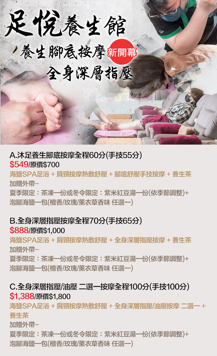 A.沐足養生腳底按摩全程60分(手技55分) / B.全身深層指壓按摩全程70分(手技65分) / C.全身深層指壓/油壓 二選一按摩全程100分(手技100分)