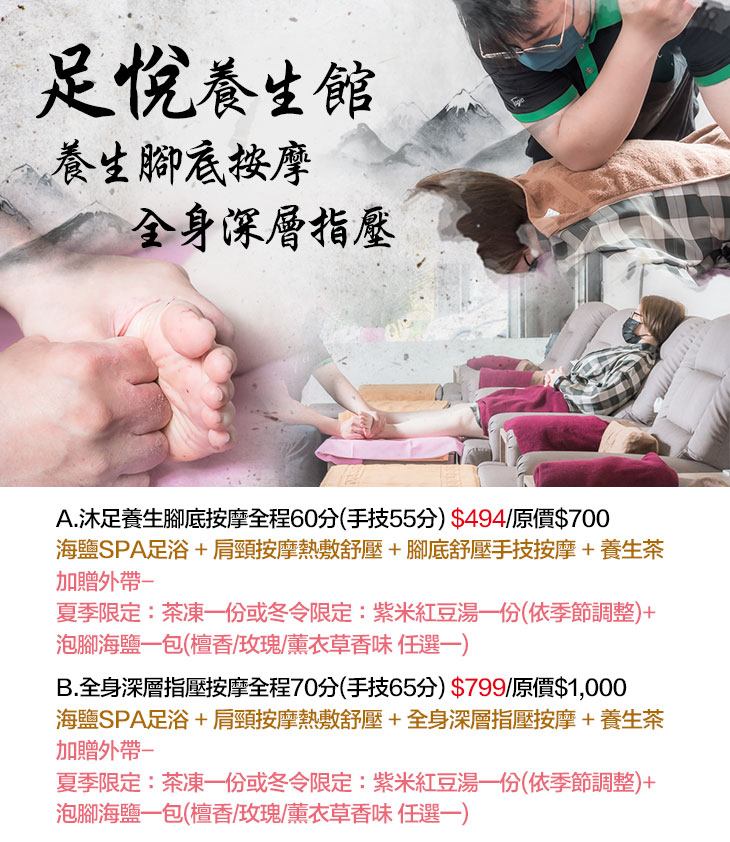 〈海鹽SPA足浴 + 肩頸按摩熱敷舒壓 + 全身深層指壓按摩 + 養生茶〉加贈外帶-夏季限定:茶凍一份或冬令限定:紫米紅豆湯一份(依季節調整)+泡腳海鹽一包(檀香/玫瑰/薰衣草香味 任選一)