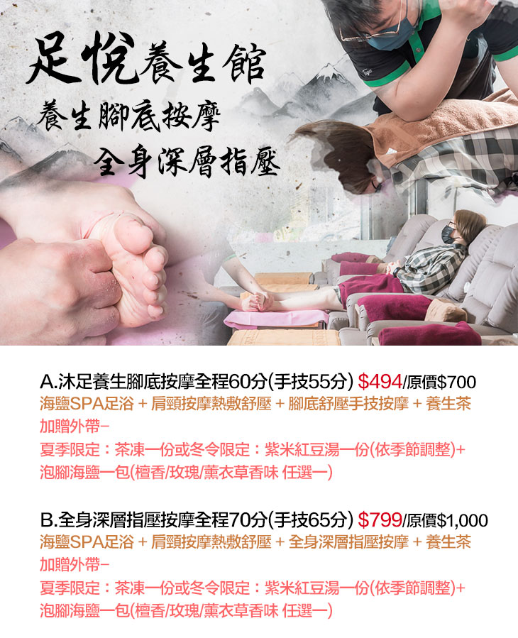 〈海鹽SPA足浴 + 肩頸按摩熱敷舒壓 + 全身深層指壓按摩 + 養生茶〉加贈外帶-夏季限定:茶凍一份或冬令限定:紫米紅豆湯一份(依季節調整)+泡腳海鹽一包(檀香/玫瑰/薰衣草香味 任選一)