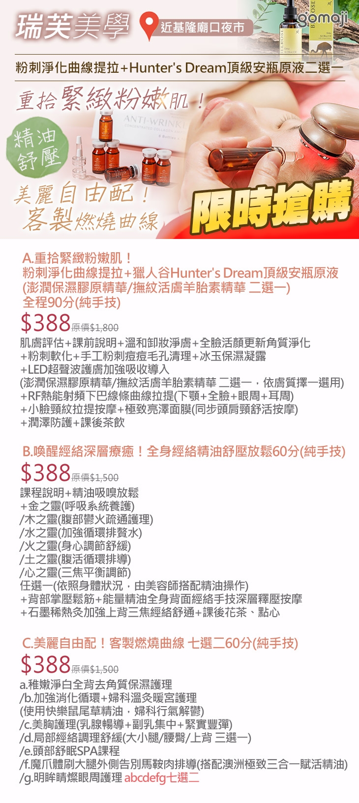 A.重拾緊緻粉嫩肌!粉刺淨化曲線提拉+獵人谷Hunter's Dream頂級安瓶原液(澎潤保濕膠原精華/撫紋活膚羊胎素精華 二選一)全程90分(純手技) / B.喚醒經絡深層療癒!全身經絡精油舒壓放鬆60分(純手技) / C.美麗自由配!客製燃燒曲線 七選二60分(純手技)