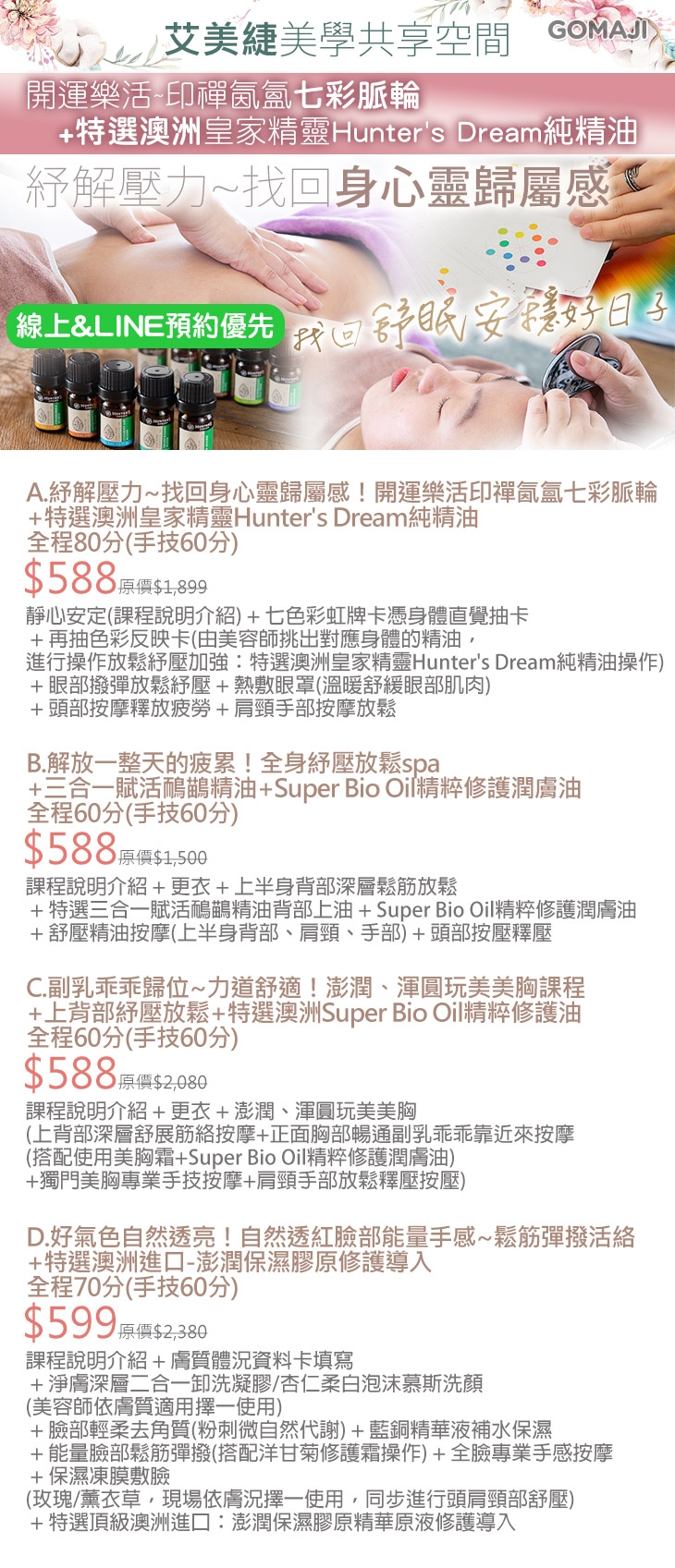 A.開運樂活印禪氤氳七彩脈輪+特選澳洲皇家精靈Hunter's Dream純精油全程80分(手技60分) / B.全身紓壓放鬆spa+三合一賦活鴯鶓精油+Super Bio Oil精粹修護潤膚油全程60分(手技60分) / C.澎潤、渾圓玩美美胸課程+上背部紓壓放鬆+特選澳洲Super Bio Oil精粹修護油全程60分(手技60分) / D.好氣色自然透亮!自然透紅臉部能量手感~鬆筋彈撥活絡+特選澳洲進口-澎潤保濕膠原修護導入全程70分(手技60分)