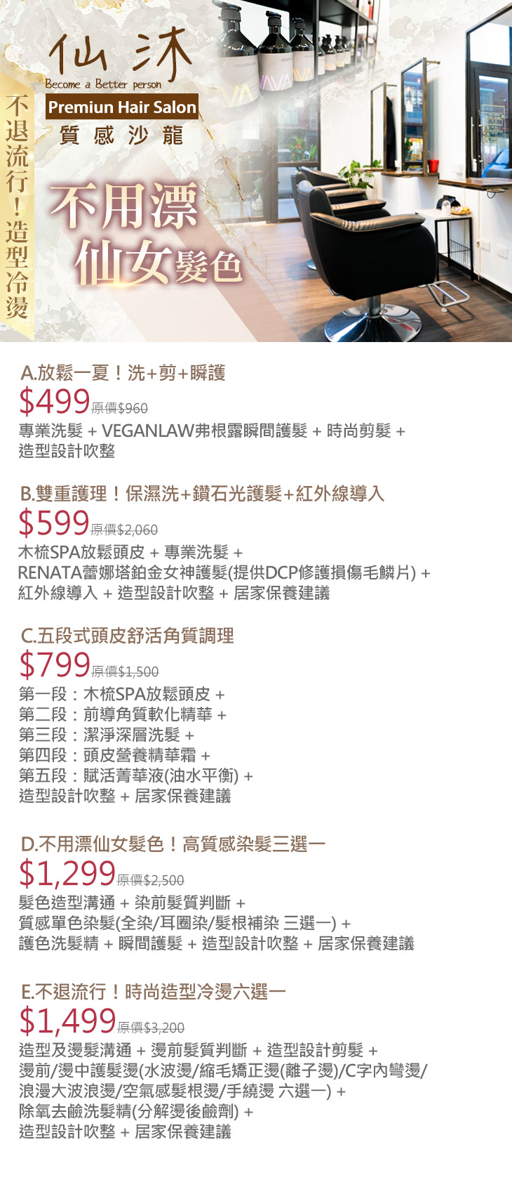 A.放鬆一夏!洗+剪+瞬護 / B.雙重護理!保濕洗+鑽石光護髮+紅外線導入 / C.五段式頭皮舒活角質調理 / D.不用漂仙女髮色!高質感染髮三選一 / E.不退流行!時尚造型冷燙六選一