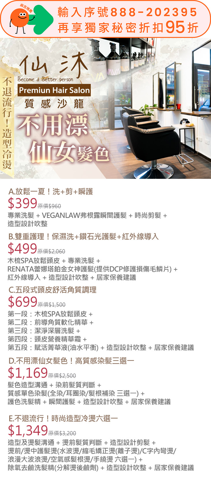 A.放鬆一夏!洗+剪+瞬護 / B.雙重護理!保濕洗+鑽石光護髮+紅外線導入 / C.五段式頭皮舒活角質調理 / D.不用漂仙女髮色!高質感染髮三選一 / E.不退流行!時尚造型冷燙六選一