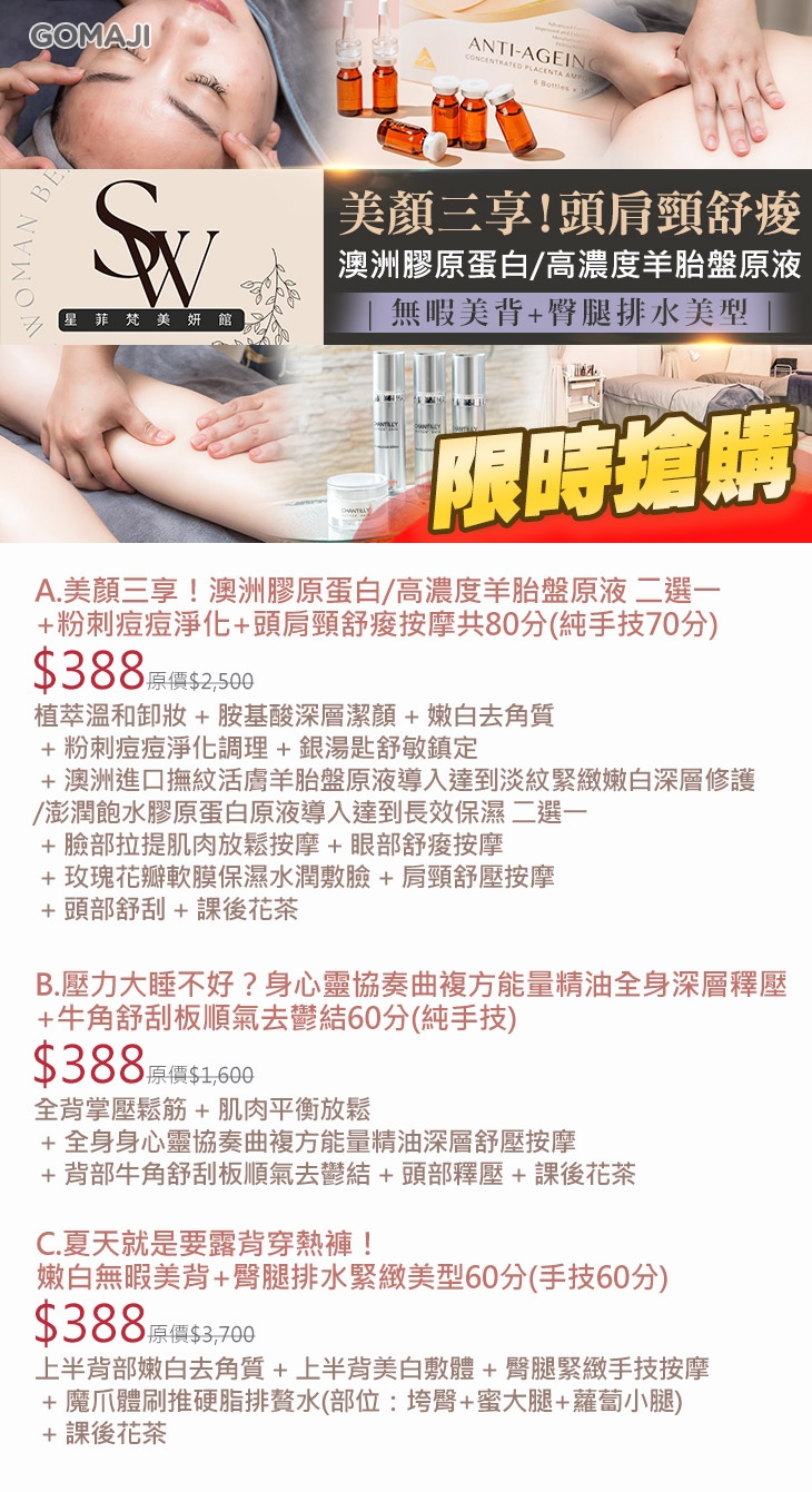 A.美顏三享!澳洲膠原蛋白/高濃度羊胎盤原液 二選一+粉刺痘痘淨化+頭肩頸舒痠按摩共80分(純手技70分) / B.壓力大睡不好?身心靈協奏曲複方能量精油全身深層釋壓+牛角舒刮板順氣去鬱結60分(純手技) / C.夏天就是要露背穿熱褲!嫩白無暇美背+臀腿排水緊緻美型60分(手技60分)
