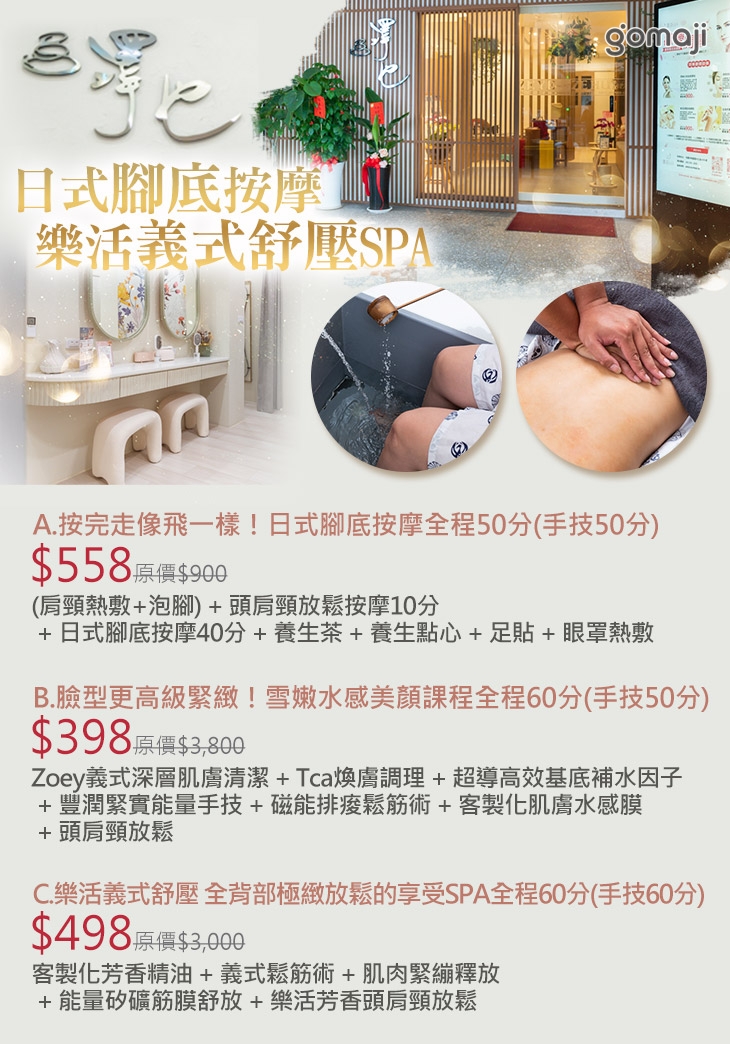 A.按完走像飛一樣!日式腳底按摩全程50分(手技50分) / B.臉型更高級緊緻!雪嫩水感美顏課程全程60分(手技50分) / C.樂活義式舒壓 全背部極緻放鬆的享受SPA全程60分(手技60分)