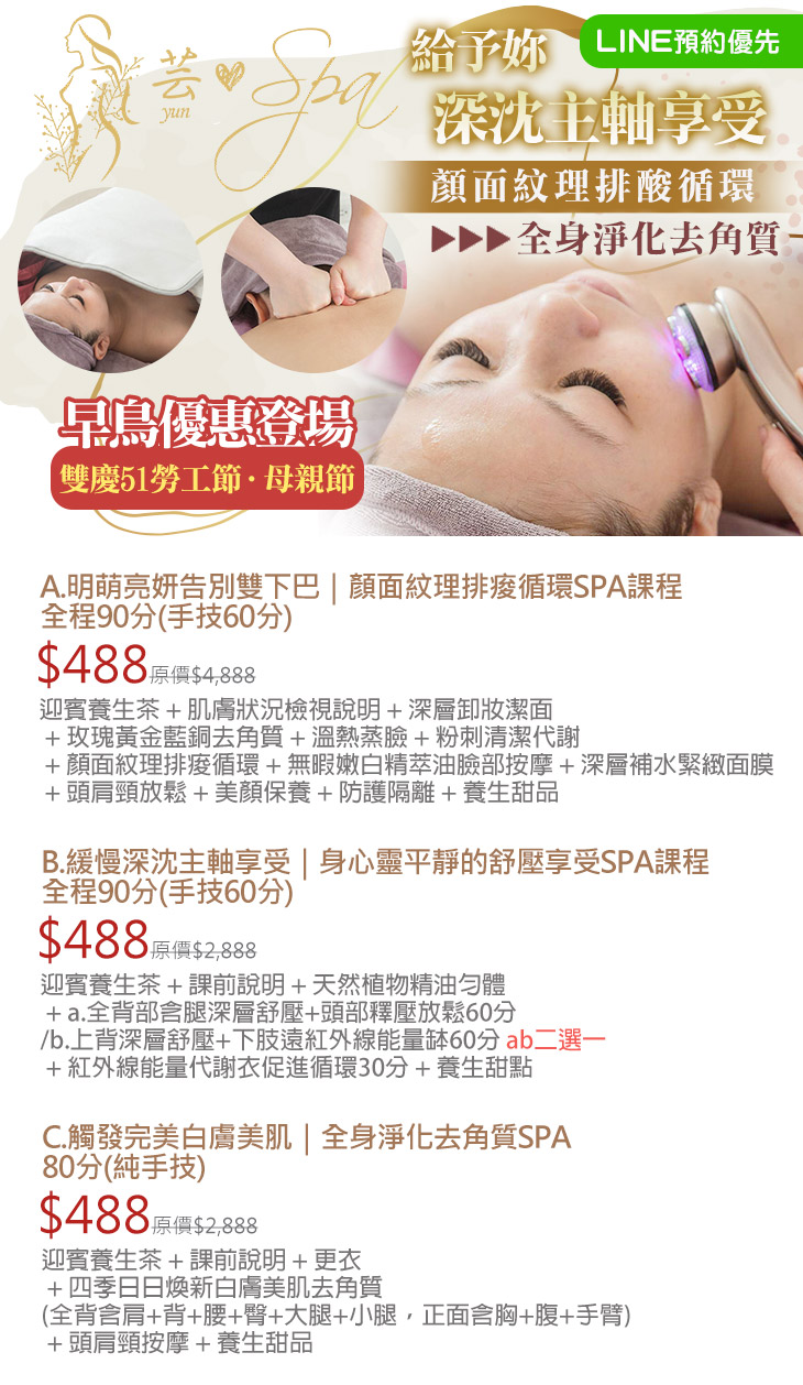 A.明萌亮妍告別雙下巴|顏面紋理排痠循環SPA課程全程90分(手技60分) / B.緩慢深沈主軸享受|身心靈平靜的舒壓享受SPA課程全程90分(手技60分) / C.觸發完美白膚美肌|全身淨化去角質SPA80分(純手技)