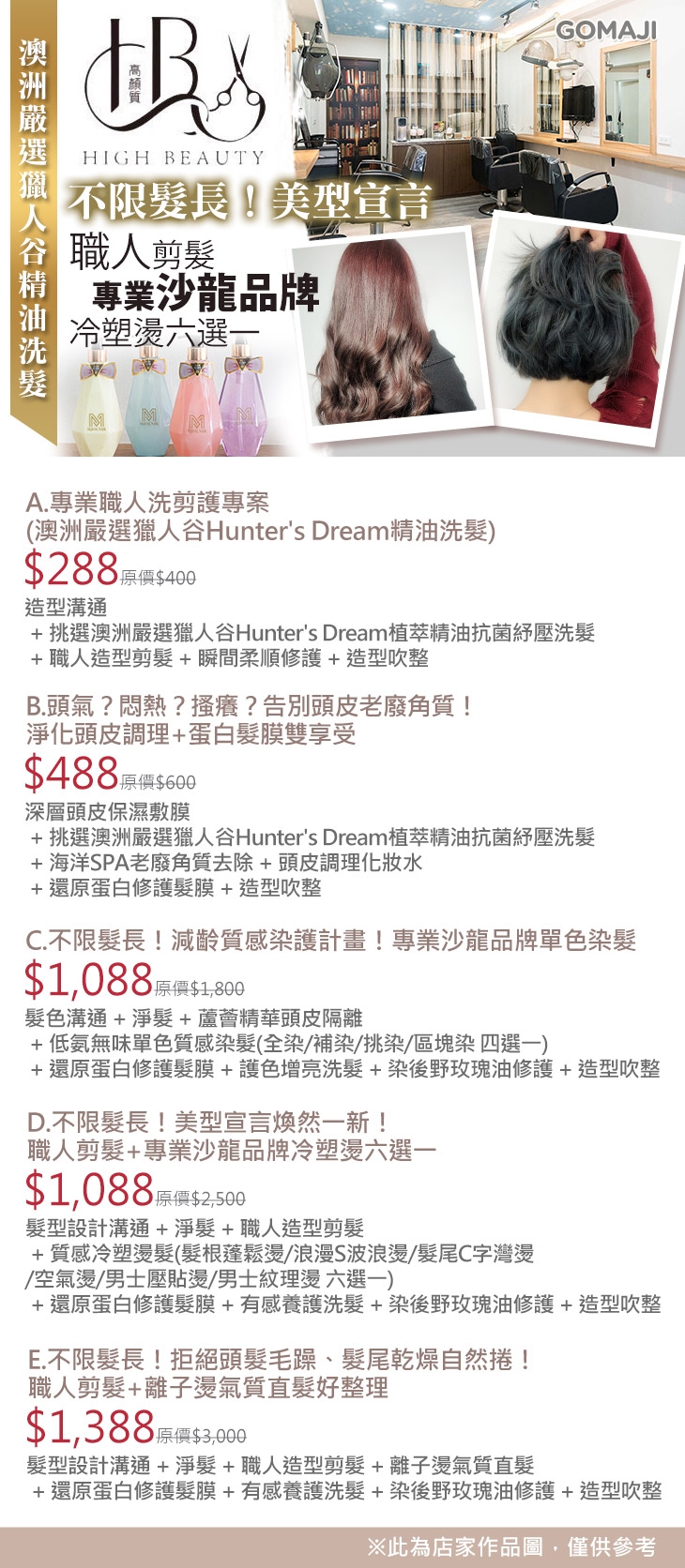 A.專業職人洗剪護專案(澳洲嚴選獵人谷Hunter's Dream精油洗髮) / B.頭氣?悶熱?搔癢?告別頭皮老廢角質!淨化頭皮調理+蛋白髮膜雙享受 / C.不限髮長!減齡質感染護計畫!專業沙龍品牌單色染髮 / D.不限髮長!美型宣言煥然一新!職人剪髮+專業沙龍品牌冷塑燙六選一 / E.不限髮長!拒絕頭髮毛躁、髮尾乾燥自然捲!職人剪髮+離子燙氣質直髮好整理