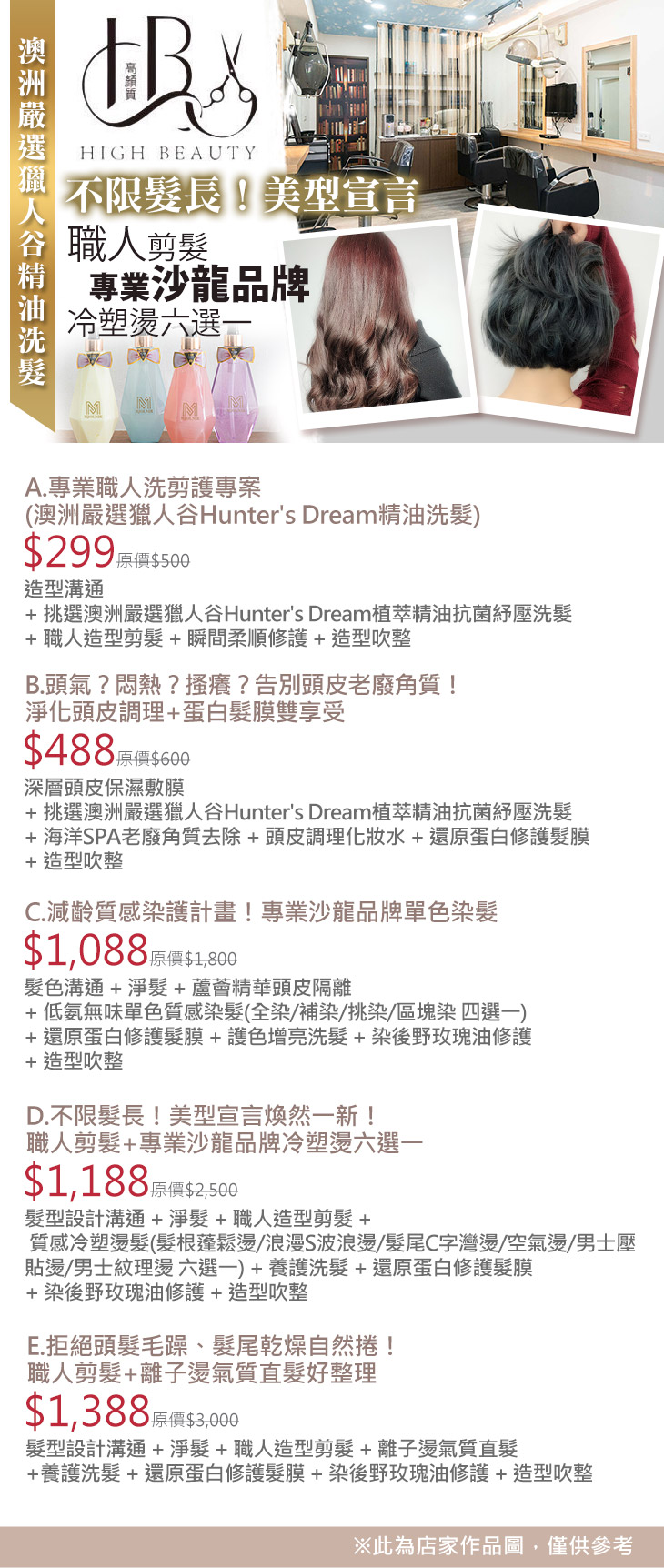 A.專業職人洗剪護專案(澳洲嚴選獵人谷Hunter's Dream精油洗髮) / B.頭氣?悶熱?搔癢?告別頭皮老廢角質!淨化頭皮調理+蛋白髮膜雙享受 / C.減齡質感染護計畫!專業沙龍品牌單色染髮 / D.不限髮長!美型宣言煥然一新!職人剪髮+專業沙龍品牌冷塑燙六選一 / E.拒絕頭髮毛躁、髮尾乾燥自然捲!職人剪髮+離子燙氣質直髮好整理