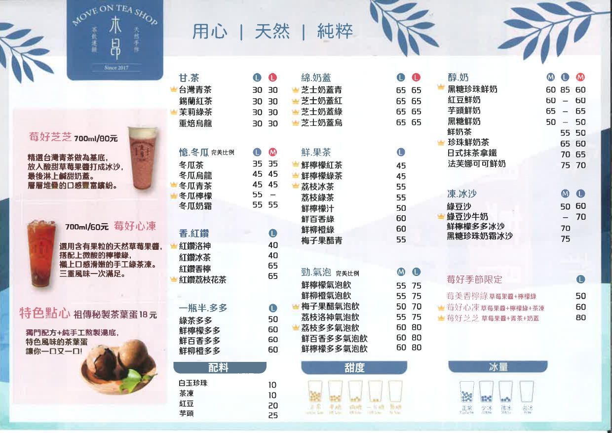 「用心將天然的原料,幻化為一抹富足滿意純粹笑容。」懷抱著對天然手作的堅持,木昂手作秉持著「以茶為底,情為韻,人為本,心為道。」的信念,多年來致力於研發茶飲。在透過無數次的熬煮、調製後,才終於設計出一杯杯經典又好喝的茶飲,為了讓好喝的茶飲能夠常伴大家左右,木昂手作也不斷地推陳出新,希望能伴隨大家一起朝著目標「Move On」!