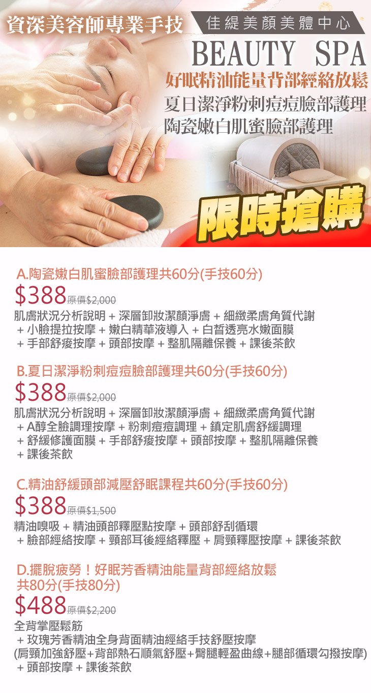 A.陶瓷嫩白肌蜜臉部護理共60分(手技60分) / B.夏日潔淨粉刺痘痘臉部護理共60分(手技60分) / C.精油舒緩頭部減壓舒眠課程共60分(手技60分) / D.擺脫疲勞!好眠芳香精油能量背部經絡放鬆共80分(手技80分)