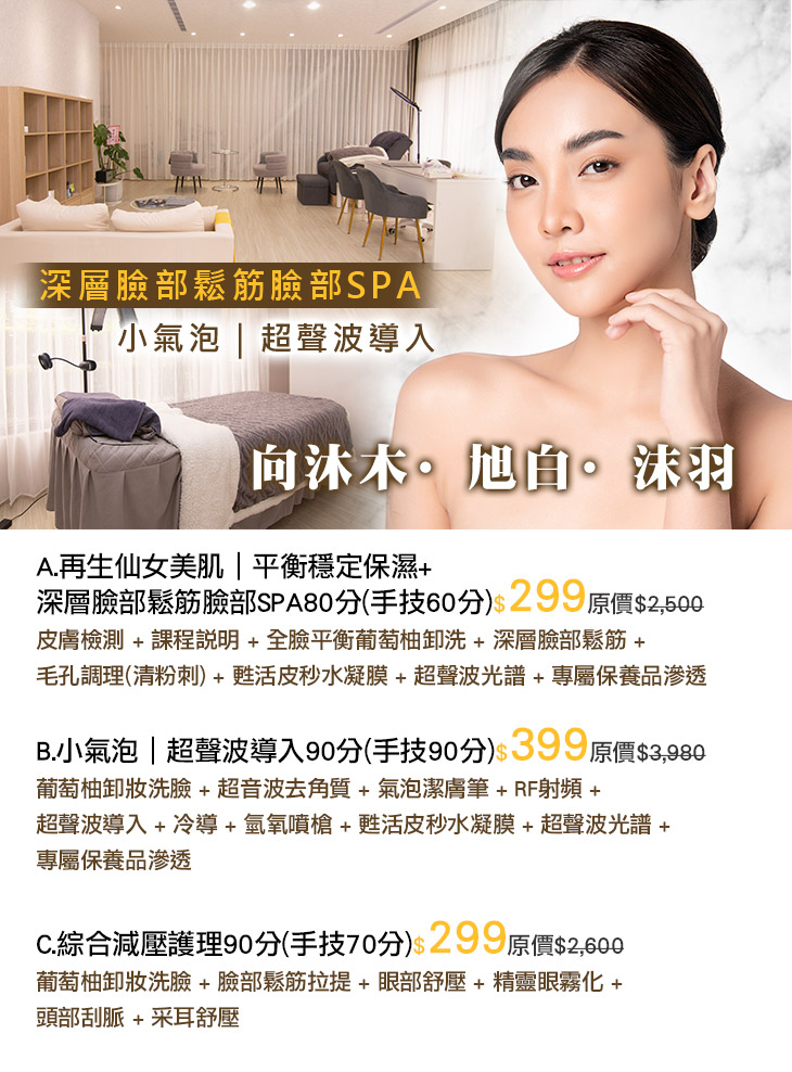 A.再生仙女美肌|平衡穩定保濕+深層臉部鬆筋臉部SPA80分(手技60分) / B.小氣泡|超聲波導入90分(手技90分) / C.綜合減壓護理90分(手技70分)