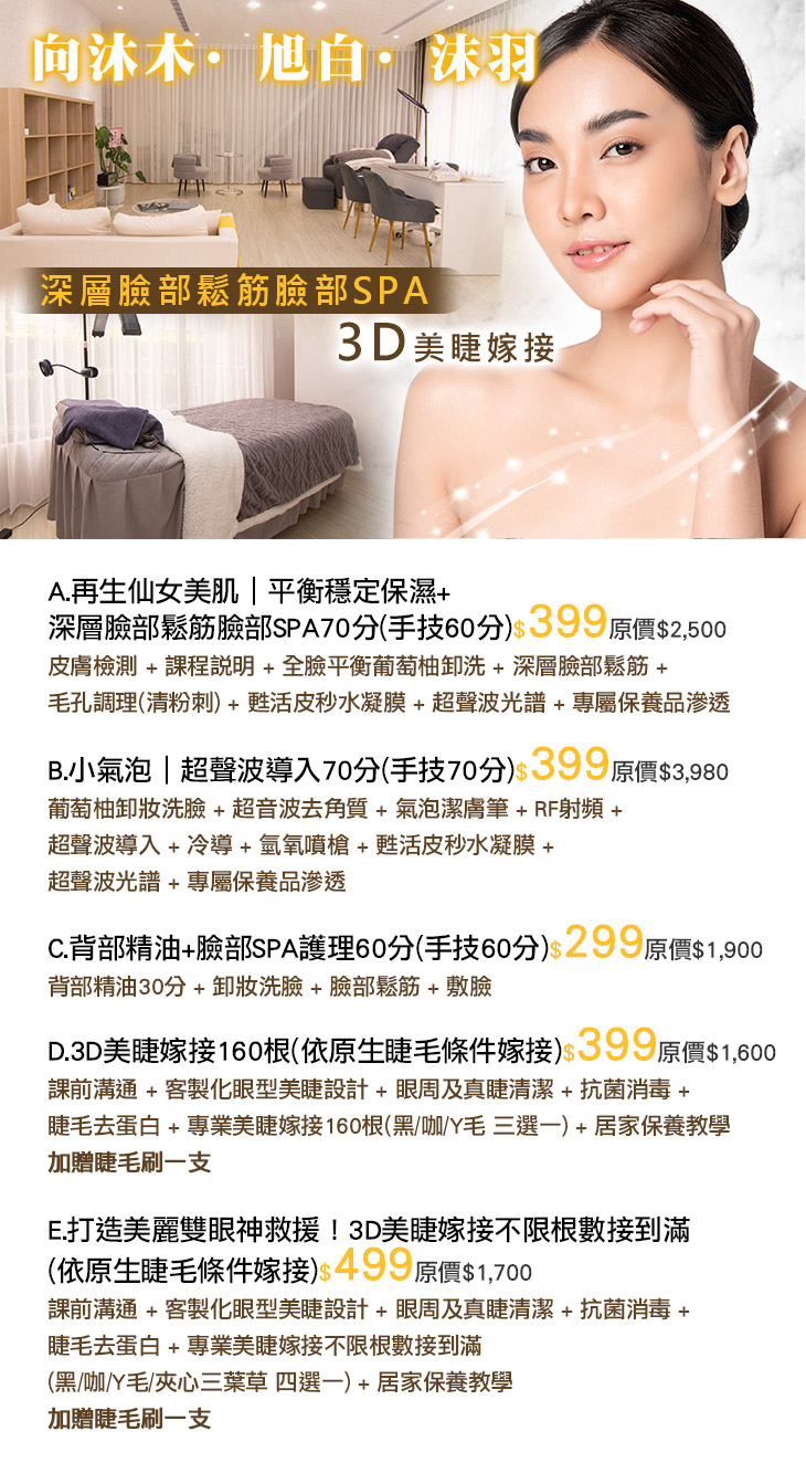 A.再生仙女美肌|平衡穩定保濕+深層臉部鬆筋臉部SPA70分(手技60分) / B.小氣泡|超聲波導入70分(手技70分) / C.背部精油+臉部SPA護理60分(手技60分) / D.3D美睫嫁接160根(依原生睫毛條件嫁接) / E.打造美麗雙眼神救援!3D美睫嫁接不限根數接到滿(依原生睫毛條件嫁接)