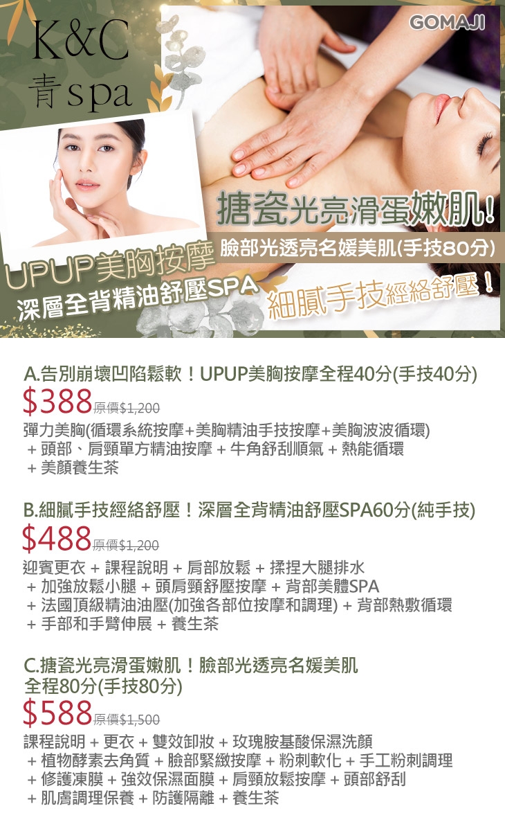 A.告別崩壞凹陷鬆軟!UPUP美胸按摩全程40分(手技40分) / B.細膩手技經絡舒壓!深層全背精油舒壓SPA60分(純手技) / C.搪瓷光亮滑蛋嫩肌!臉部光透亮名媛美肌全程80分(手技80分)