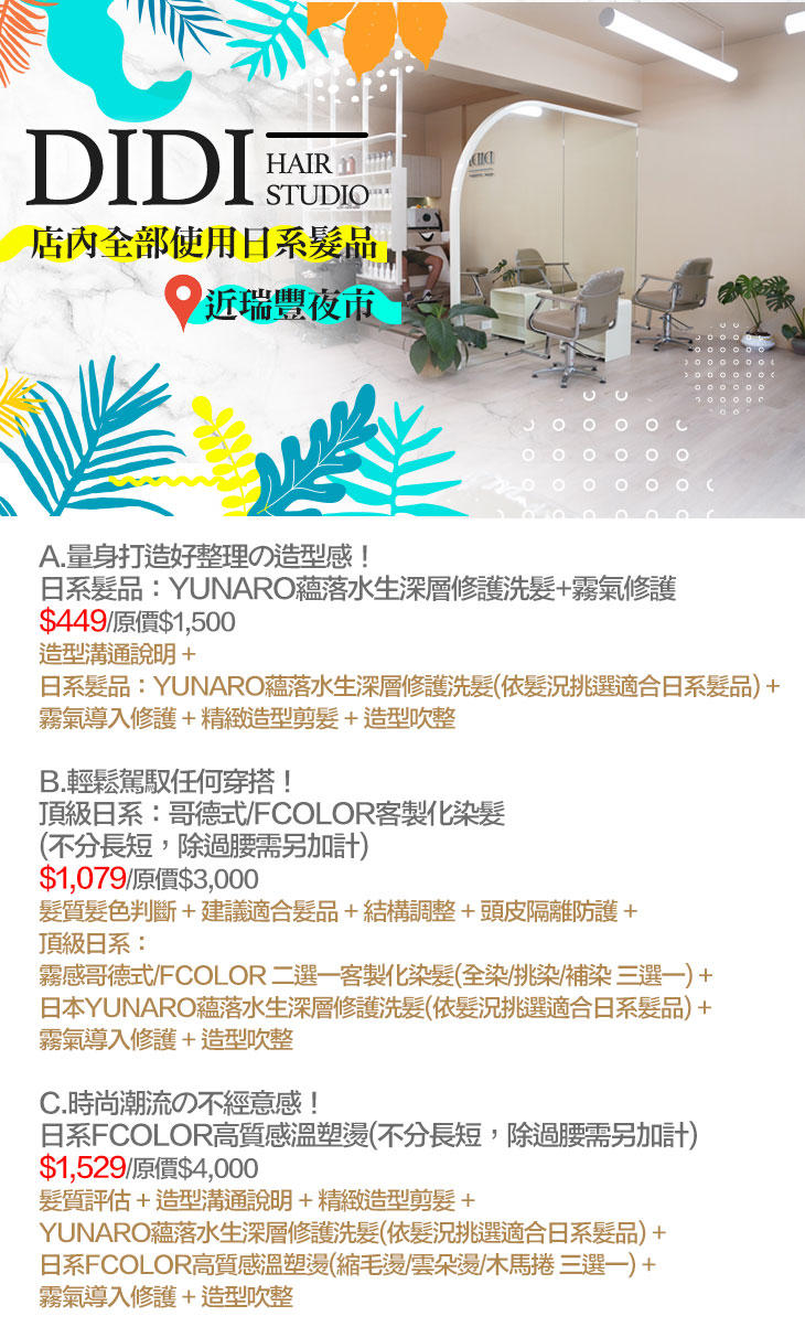 A.量身打造好整理の造型感!日系髮品:YUNARO蘊落水生深層修護洗髮+霧氣修護 / B.輕鬆駕馭任何穿搭!頂級日系:哥德式/Fcolor客製化染髮(不分長短,除過腰需另加計) / C.時尚潮流の不經意感!日系Fcolor高質感溫塑燙(不分長短,除過腰需另加計)