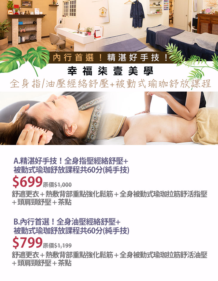 A.精湛好手技!全身指壓經絡舒壓+被動式瑜珈舒放課程共60分(純手技)
