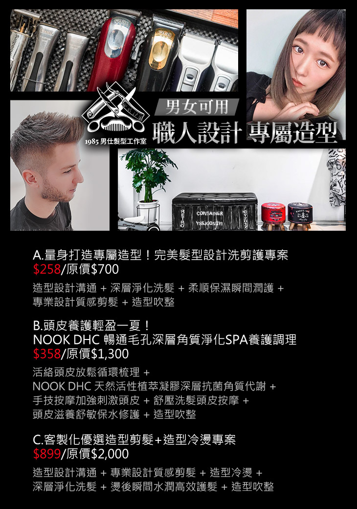 A.量身打造專屬造型!完美髮型設計洗剪護專案 / B.頭皮養護輕盈一夏!NOOK DHC 暢通毛孔深層角質淨化SPA養護調理 / C.客製化優選造型剪髮+造型冷燙專案