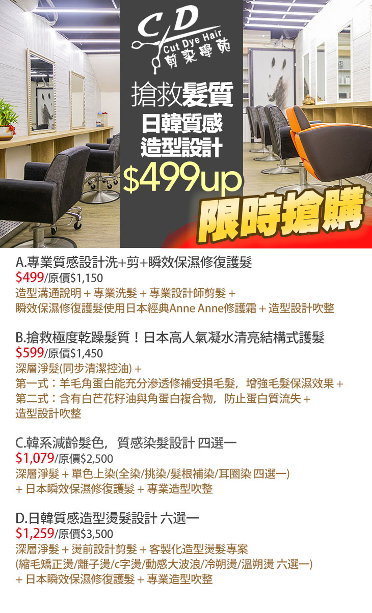 A.襯托臉型更完美造型洗+剪 / B.搶救極度乾躁髮質!高人氣凝水輕亮結構式護髮 / C.讓您從邋遢人!秒變質感歐美帥哥、美女專業染髮專案(全染/挑染/髮根補染/耳圈染 四選一) / D.更有型又好整理!客製化造型燙髮專案(縮毛矯正燙/離子燙/c字燙/動感大波浪/冷朔燙/溫朔燙 六選一)