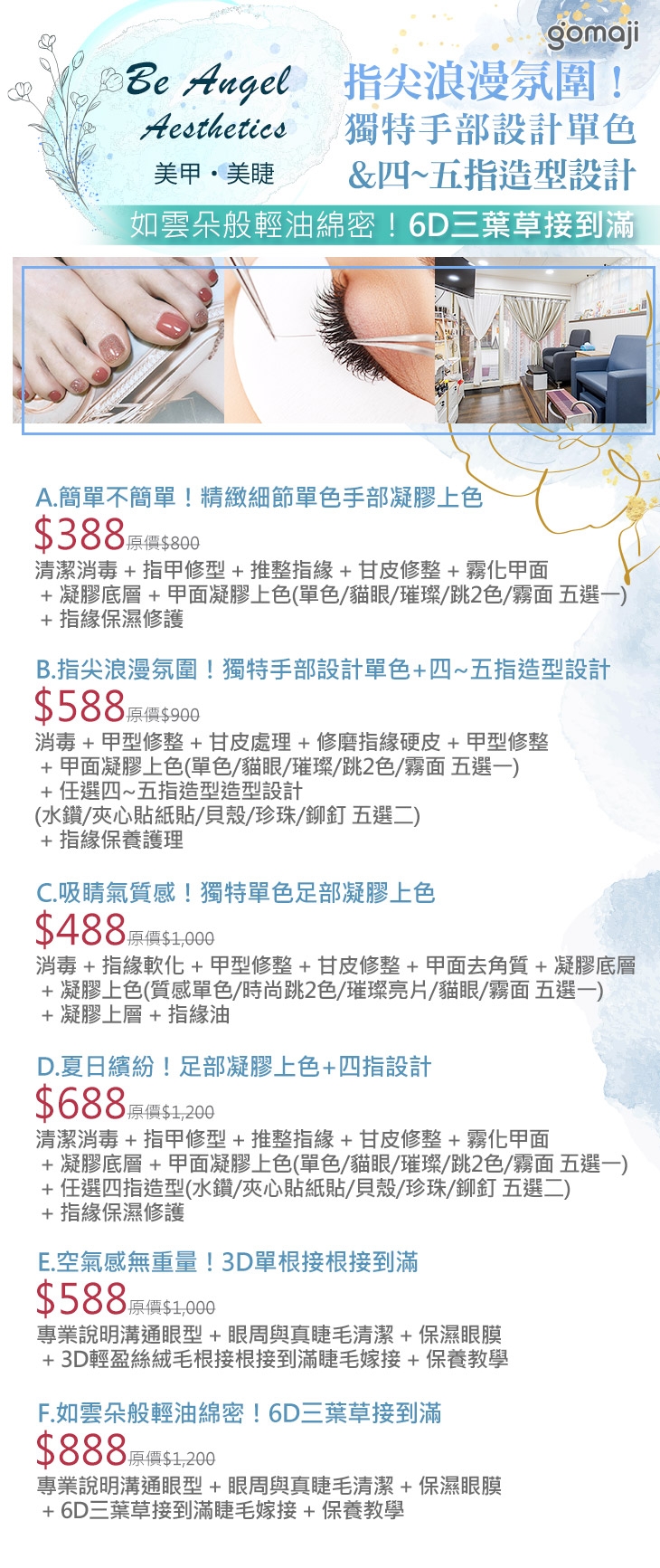 A.簡單不簡單!精緻細節單色手部凝膠上色 / B.指尖浪漫氛圍!獨特手部設計單色+四~五指造型設計 / C.吸睛氣質感!獨特單色足部凝膠上色 / D.夏日繽紛!足部凝膠上色+四指設計 / E.空氣感無重量!3D單根接根接到滿 / F.如雲朵般輕油綿密!6D三葉草接到滿