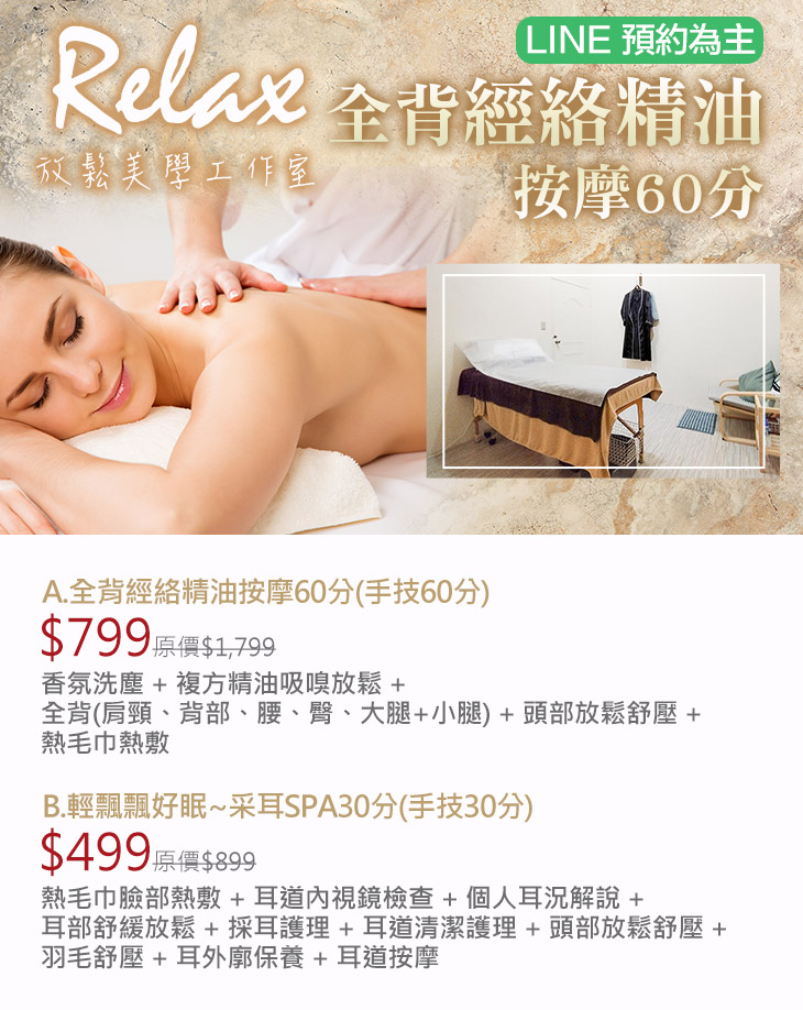〈香氛洗塵 + 複方精油吸嗅放鬆 + 全背(肩頸、背部、腰、臀、大腿+小腿) + 頭部放鬆舒壓 + 熱毛巾熱敷〉