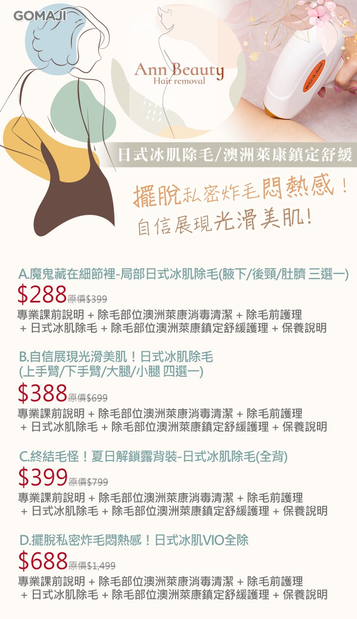 A.魔鬼藏在細節裡-局部日式冰肌除毛(腋下/後頸/肚臍 三選一) / B.自信展現光滑美肌!日式冰肌除毛(上手臂/下手臂/大腿/小腿 四選一) / C.終結毛怪!夏日解鎖露背裝-日式冰肌除毛(全背) / D.擺脫私密炸毛悶熱感!日式冰肌VIO全除