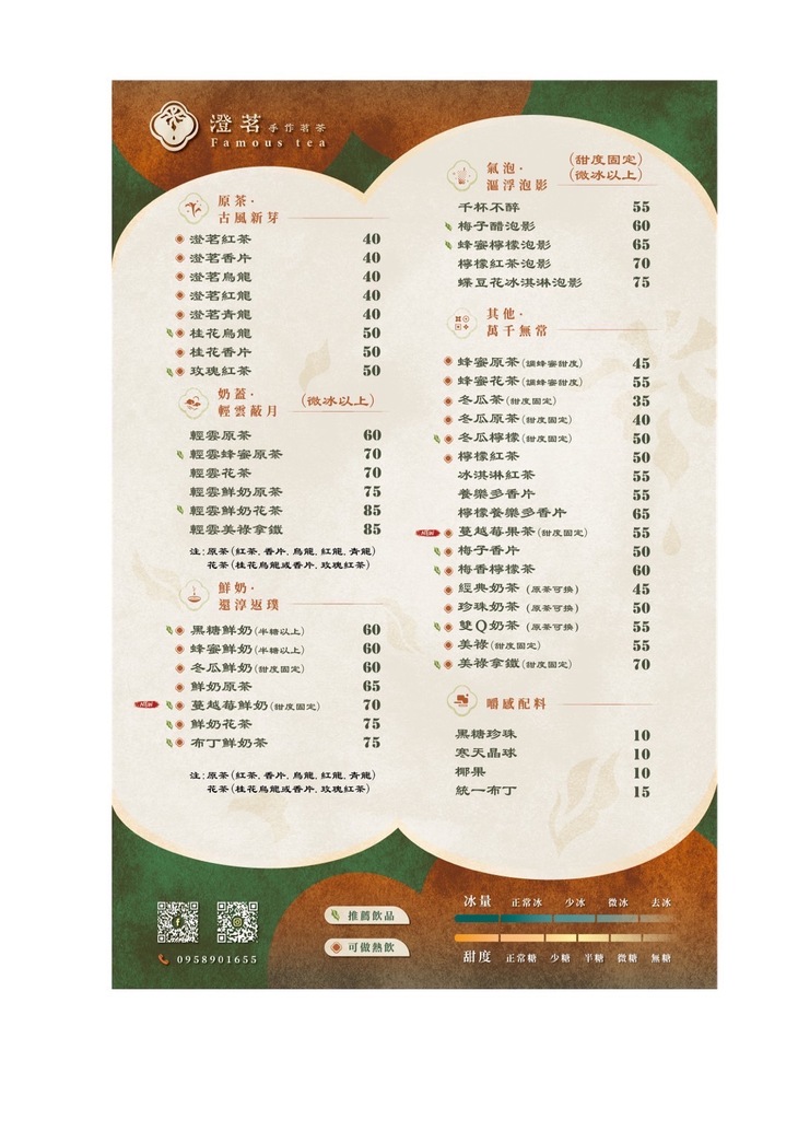 由3個喜歡品茶的大男孩,透過一次一次的不斷嘗試,找到了最純粹的美好茶味,最後創業開了「澄茗手作茗茶」。精心挑選優質茶葉,結合創意與熟練的手藝,研發出多種特色飲品,讓顧客能夠品味到茶葉的風味與茶文化的魅力,無論您是茶飲愛好者,或是喜愛特色手作飲品,都能在這裡得到味蕾上的滿足!老闆堅持提供給顧客高品質茶飲,不僅鮮美可口,還注重保留茶葉本身的原汁原味,也提供多種創新的茶飲選擇,帶來全新的味覺享受~用心為每位顧客提供獨特的茶飲體驗,讓您在品茶的過程中感受到輕鬆、愉悅和滿足!