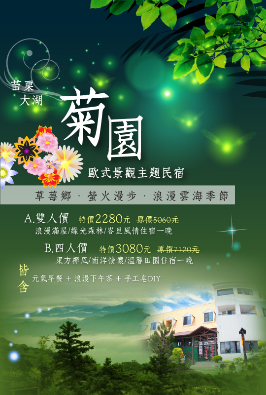 位於苗栗大湖鄉的【菊園景觀主題民宿】,為大湖第一家歐式造型景觀民宿。身處海拔800公尺的山腰上,從清晨的雲海日出,到日落的浪漫彩霞,從隆冬漸暖的繽紛春櫻花、夏季雪白的油桐花、秋天的柑桔、至冬季草莓,變幻萬千的四季景致,不管何時蒞臨,都能充分感受到自然美景帶給您的感動,即使只是靜靜的坐在涼亭中發呆,也能輕易的得到難得的悠閒與解放。