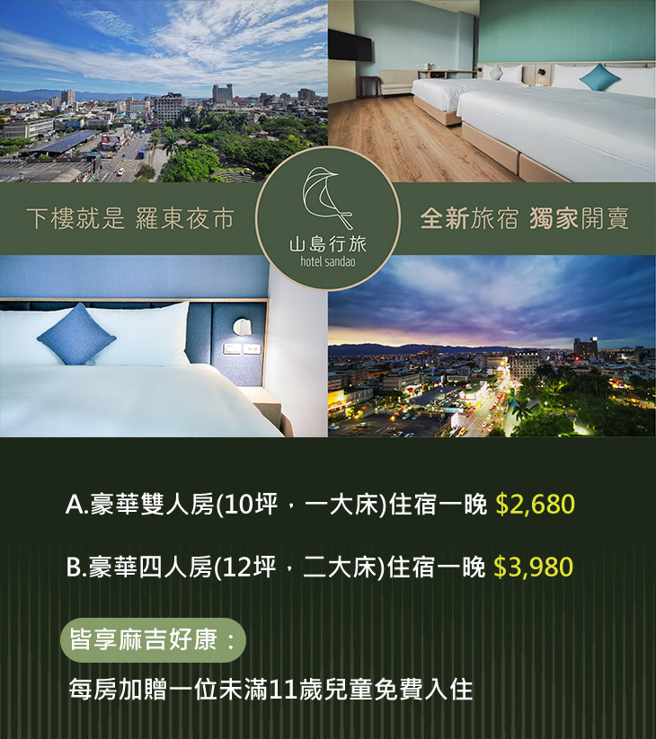 全新旅宿品牌!位於羅東市中心的精華地帶,交通便利。品牌以創造質感空間為核心理念,並以大地色彩為設計主軸,營造溫馨舒適的環境~在設施方面,採用了星級飯店等級的設備與備品,確保每位旅客的舒適體驗!山島行旅的願景是成為您繁忙日常生活中的一處歇息之地,讓您在忙碌中得以停靠,輕鬆休憩,不論是商務出差或是休閒旅遊,這裡都是您放鬆身心的理想選擇~無論您是尋找短暫歇息的場所,或是樂於享受美好住宿的品味,山島行旅都將竭誠歡迎您的光臨!