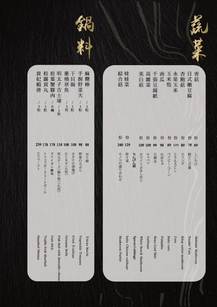 來一場低調奢華的美食饗宴!選用頂級的海鮮與高品質肉品,經過精心處理,完美呈現食材的原始風味,無論搭配清爽或濃郁的湯底,每一口都是對味蕾的極致享受。店內雅致而充滿現代感的設計,與自然元素結合,每一個包廂皆以木質框架搭配簾幕設計,提供客人隱私感,讓人享有專屬的用餐空間,在細節處處顯現店家的用心與品味,為您帶來視覺與味覺的雙重享受。
