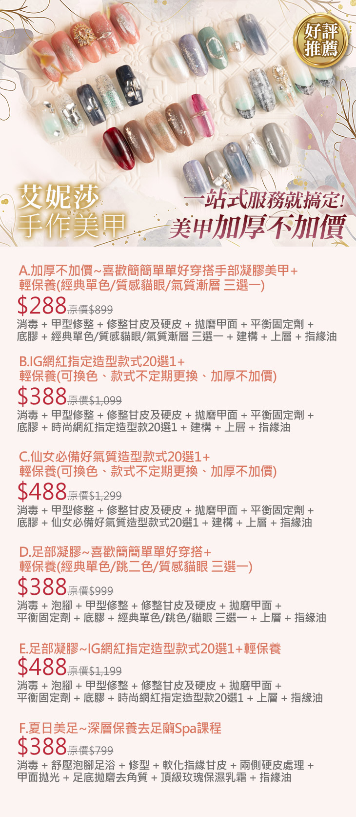 A.加厚不加價~喜歡簡簡單單好穿搭手部凝膠美甲+輕保養(經典單色/質感貓眼/氣質漸層 三選一) / B.IG網紅指定造型款式20選1+輕保養(可換色、款式不定期更換、加厚不加價) / C.仙女必備好氣質造型款式20選1+輕保養(可換色、款式不定期更換、加厚不加價) / D.足部凝膠~喜歡簡簡單單好穿搭+輕保養(經典單色/跳二色/質感貓眼 三選一) / E.足部凝膠~IG網紅指定造型款式20選1+輕保養 / F.夏日美足~深層保養去足繭Spa課程