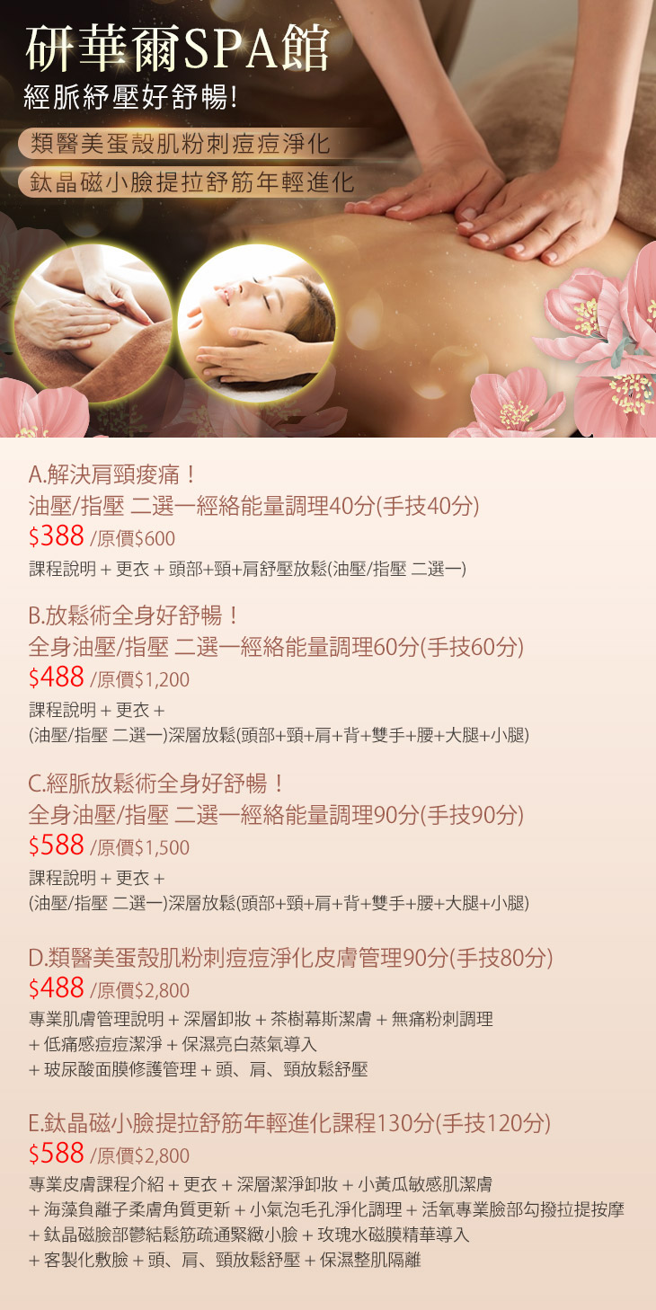 A.解決肩頸痠痛!油壓/指壓 二選一經絡能量調理40分(手技40分) / B.放鬆術全身好舒暢!全身油壓/指壓 二選一經絡能量調理60分(手技60分) / C.經脈放鬆術全身好舒暢!全身油壓/指壓 二選一經絡能量調理90分(手技90分) / D.類醫美蛋殼肌粉刺痘痘淨化皮膚管理90分(手技80分) / E.鈦晶磁小臉提拉舒筋年輕進化課程130分(手技120分)