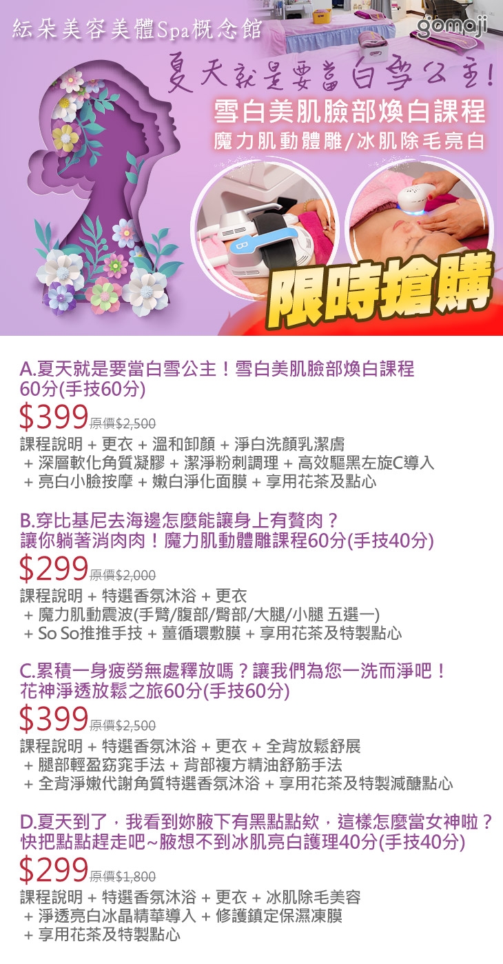 A.夏天就是要當白雪公主!雪白美肌臉部煥白課程60分(手技60分) / B.穿比基尼去海邊怎麼能讓身上有贅肉?讓你躺著消肉肉!魔力肌動體雕課程60分(手技40分) / C.累積一身疲勞無處釋放嗎?讓我們為您一洗而淨吧!花神淨透放鬆之旅60分(手技60分) / D.夏天到了,我看到妳腋下有黑點點欸,這樣怎麼當女神啦?快把點點趕走吧~腋想不到冰肌亮白護理40分(手技40分)