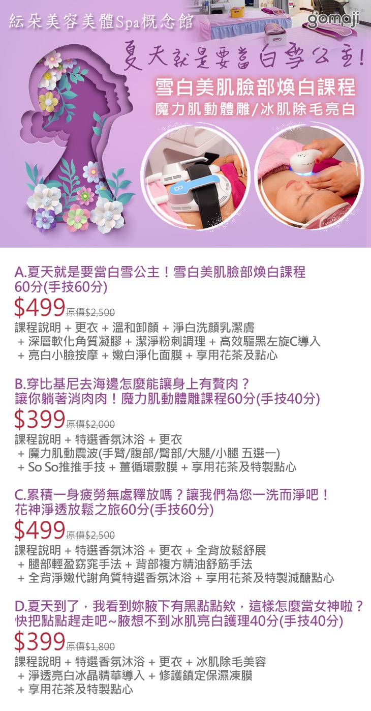 A.夏天就是要當白雪公主!雪白美肌臉部煥白課程60分(手技60分) / B.穿比基尼去海邊怎麼能讓身上有贅肉?讓你躺著消肉肉!魔力肌動體雕課程60分(手技40分) / C.累積一身疲勞無處釋放嗎?讓我們為您一洗而淨吧!花神淨透放鬆之旅60分(手技60分) / D.夏天到了,我看到妳腋下有黑點點欸,這樣怎麼當女神啦?快把點點趕走吧~腋想不到冰肌亮白護理40分(手技40分)