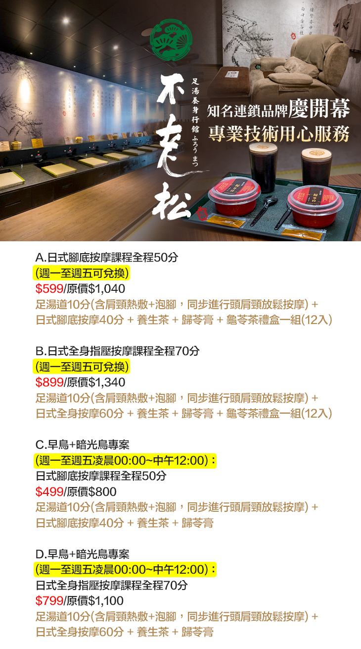 A.日式腳底按摩課程全程50分(週一至週五可兌換) / B.日式全身指壓按摩課程全程70分(週一至週五可兌換) / C.早鳥+暗光鳥專案(週一至週五凌晨00:00~中午12:00):日式腳底按摩課程全程50分 / D.早鳥+暗光鳥專案(週一至週五凌晨00:00~中午12:00):日式全身指壓按摩課程全程70分